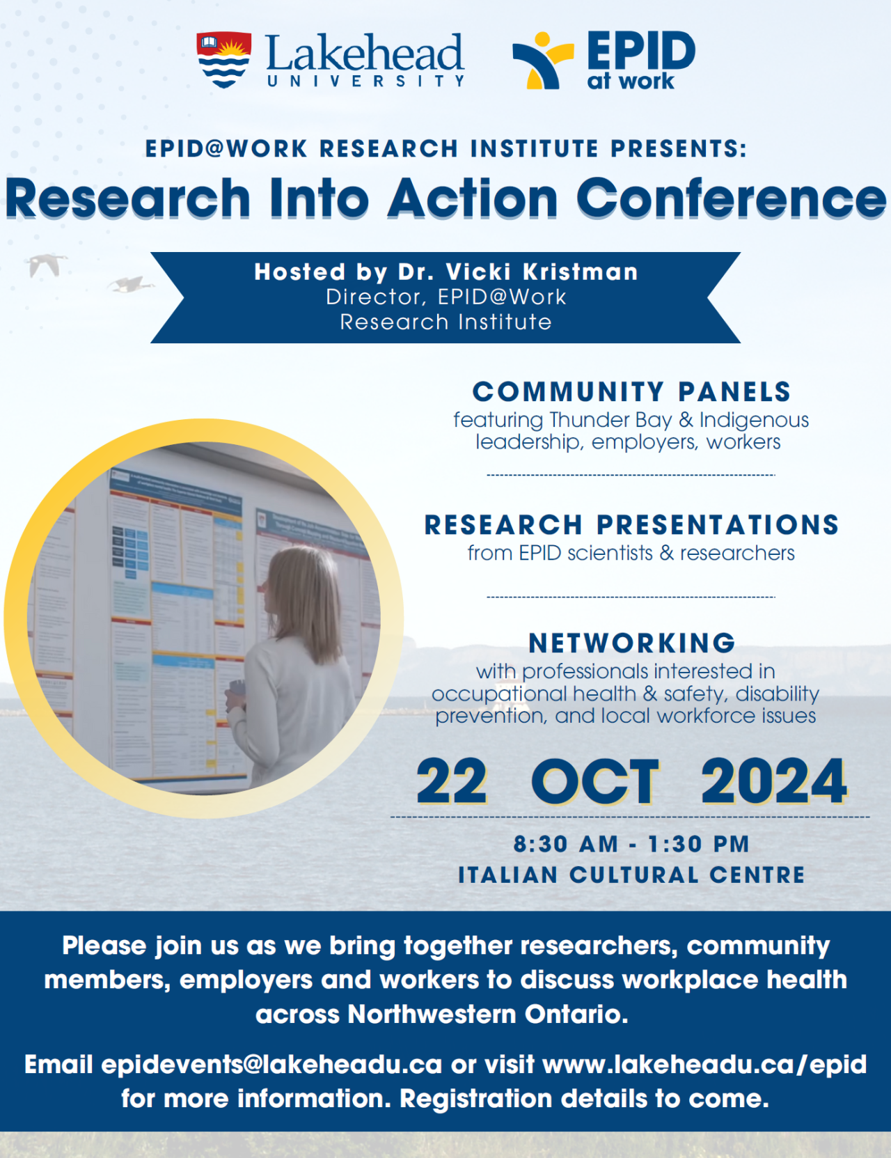 Please join us as we bring together researchers, community members, employers and workers to explore the importance of regional research and collaboration. Hosted by the EPID@Work Research Institute at Lakehead University, our Research Into Action Conference will include community panels discussing why research matters in Northwestern Ontario, research presentations from EPID@Work scientists and researchers, and networking with professionals interested in occupational health & safety, disability prevention, and local workforce issues.