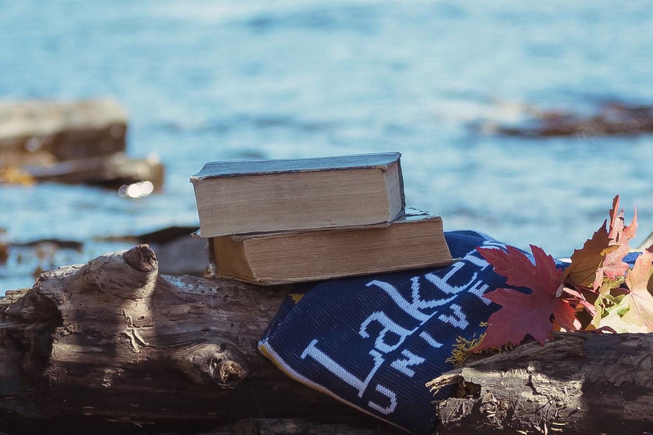 Image of Lakehead University Scarf, Maple Leaves, and books on top of a rock with water in the background
